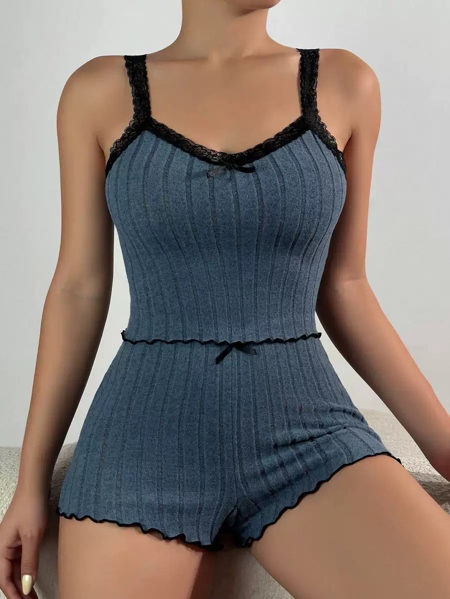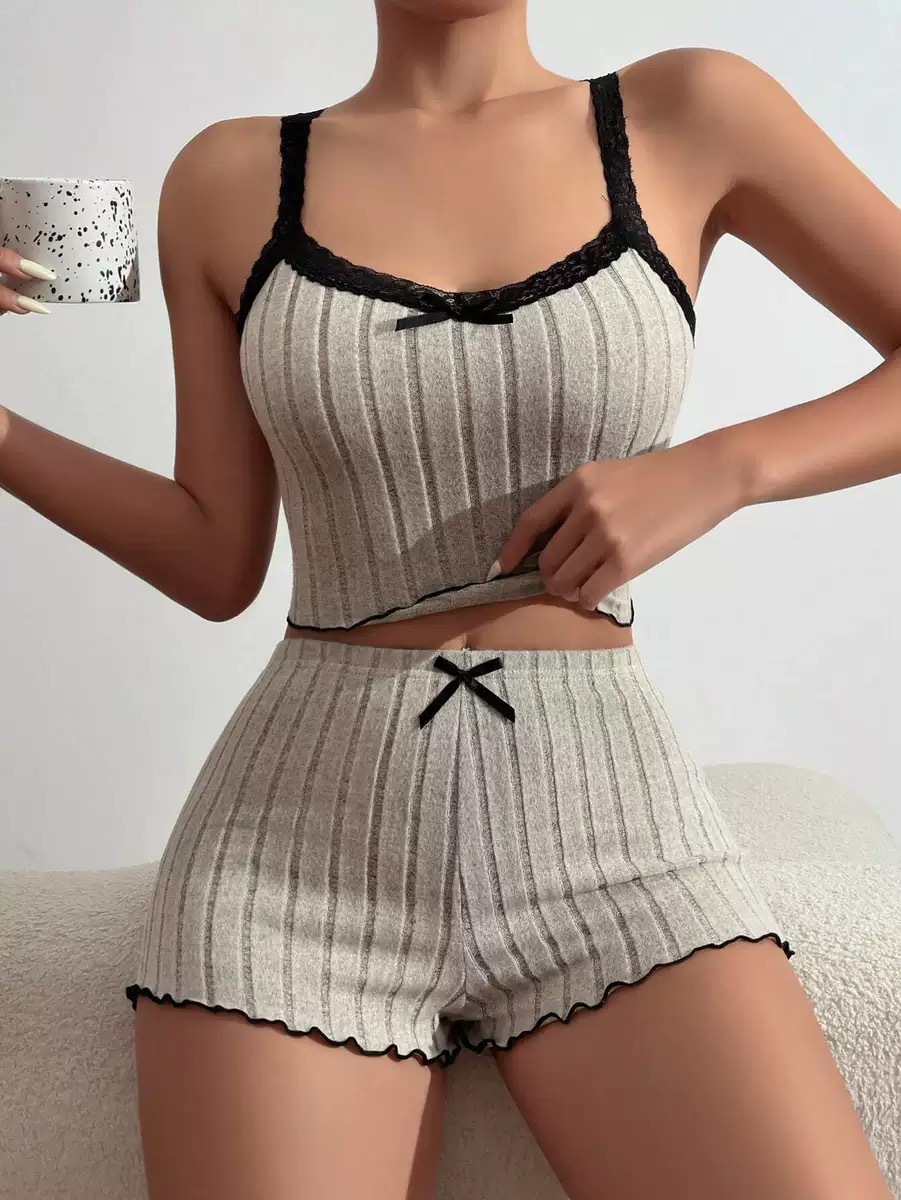 The Layrix Ribbed Lace Trim Lounge Set is designed for effortless at home elegance. Featuring a fitted ribbed cami with delicate lace trim and matching high waist shorts, this set enhances your natural silhouette while delivering breathable comfort.