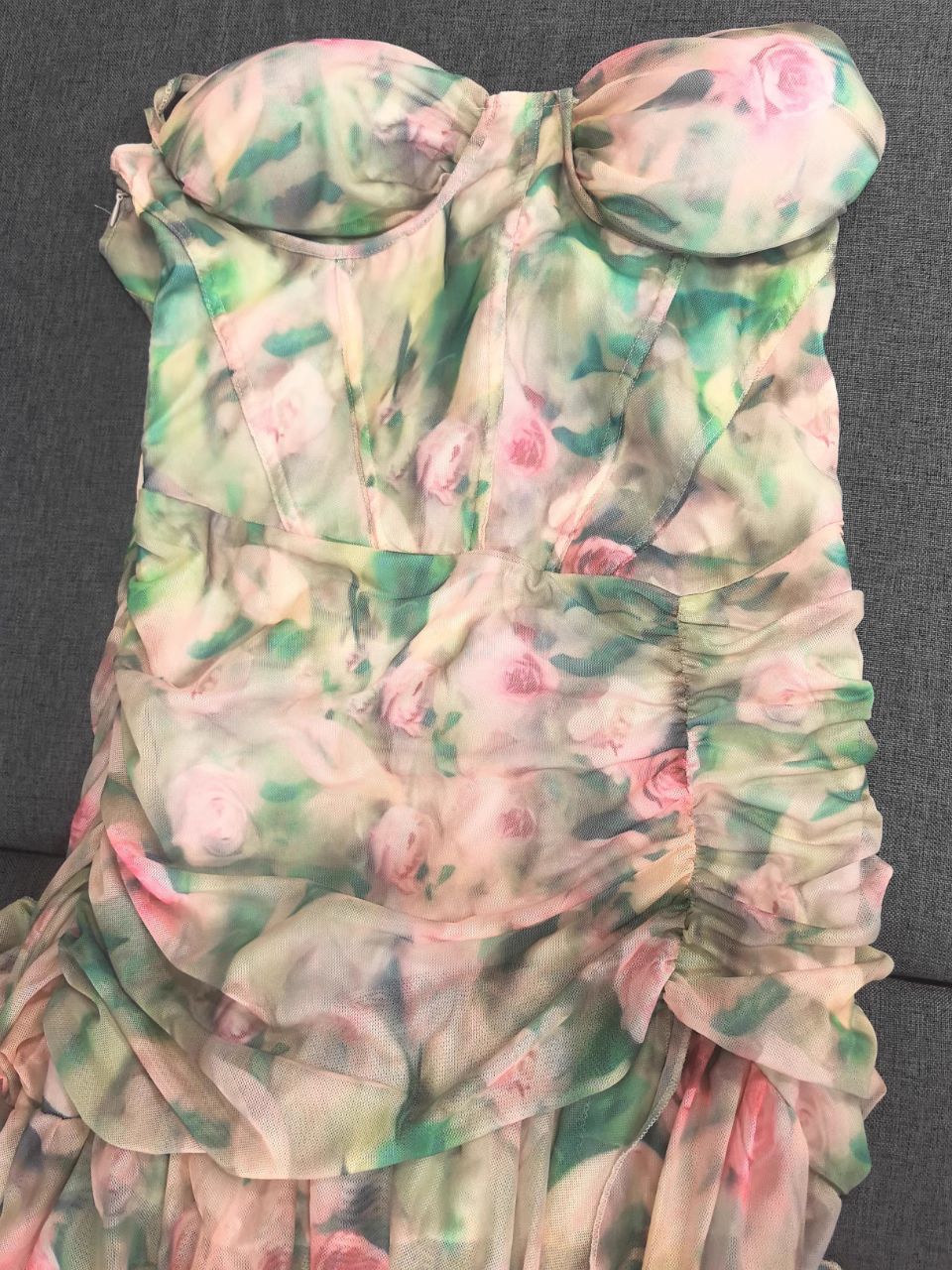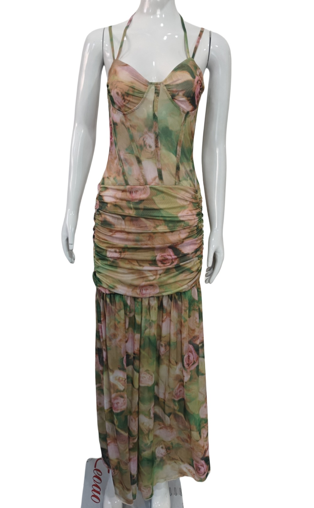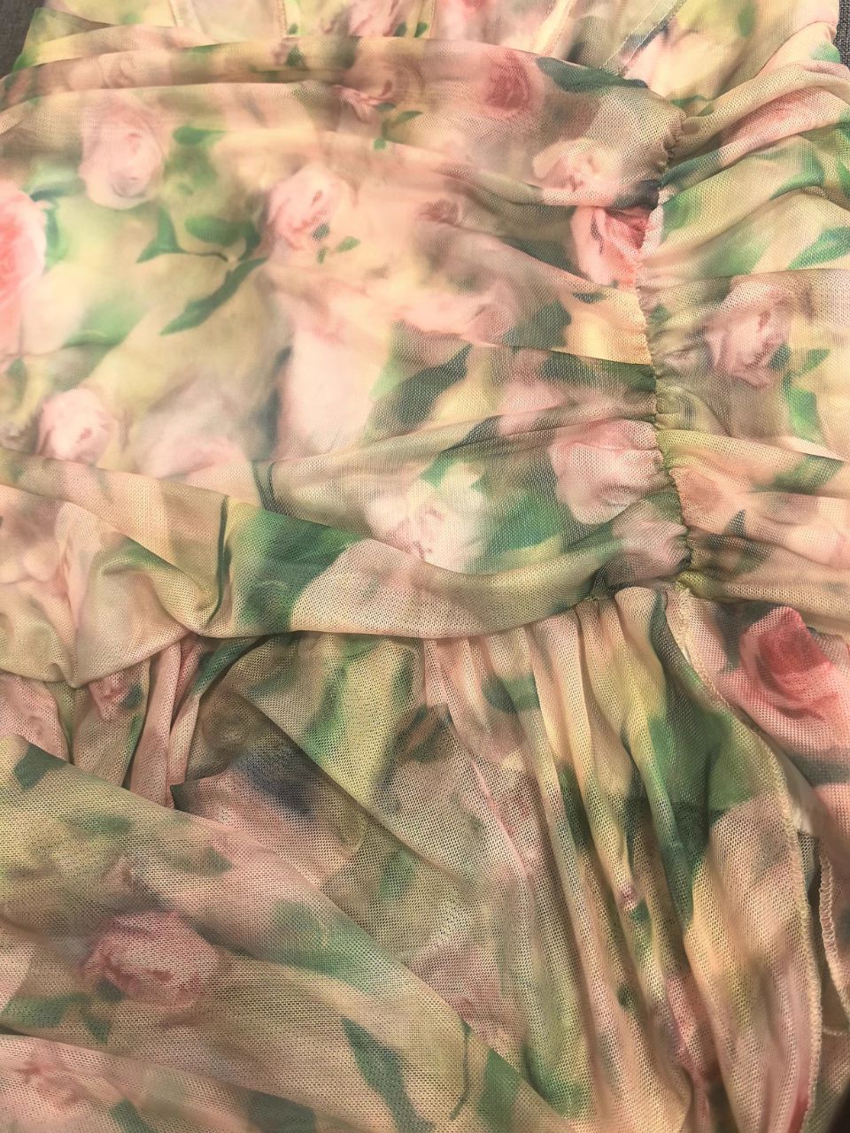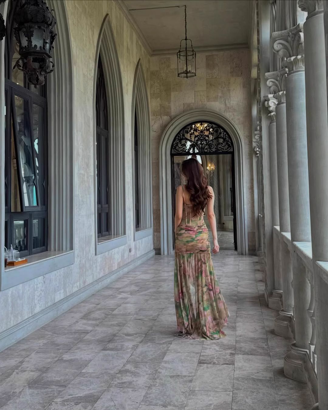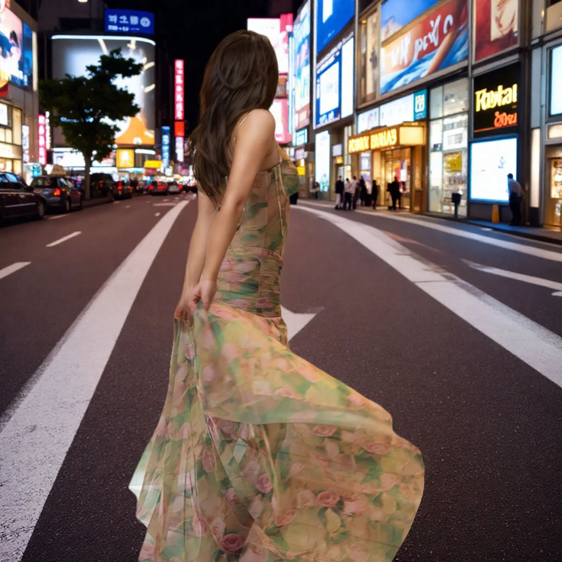 The soft floral print paired with a structured bodice creates a sculpted yet feminine look. The lightweight fabric flows beautifully with every step, making it perfect for vacations, summer evenings, and statement daytime styling.